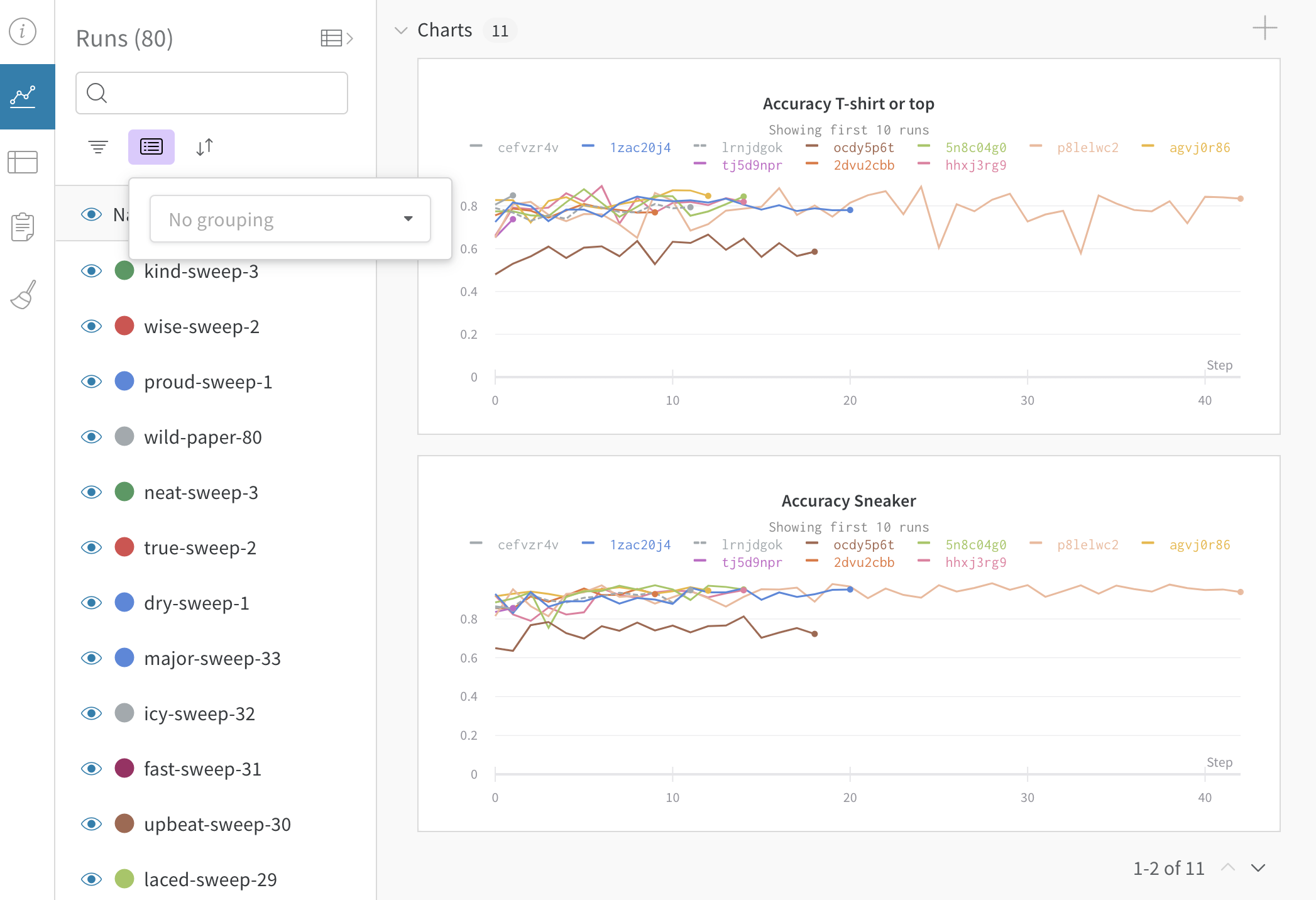 任意の列でrunをグループ化できます。例として、ハイパーパラメーターでグループ化することができます。これがどのように見えるかの例です: