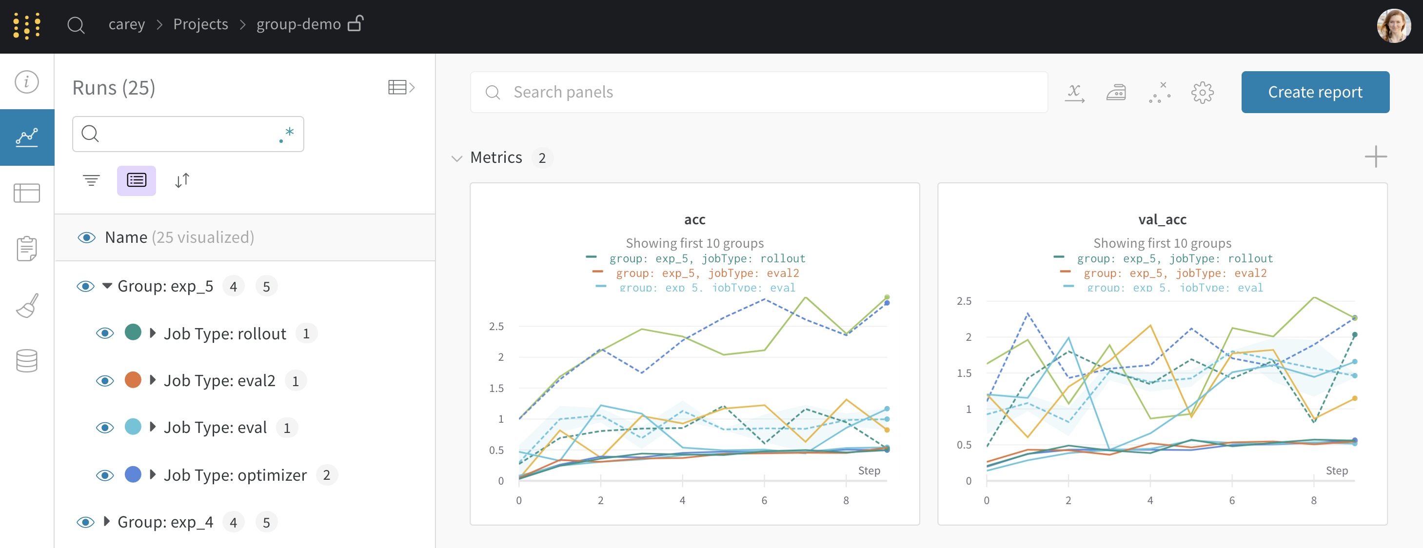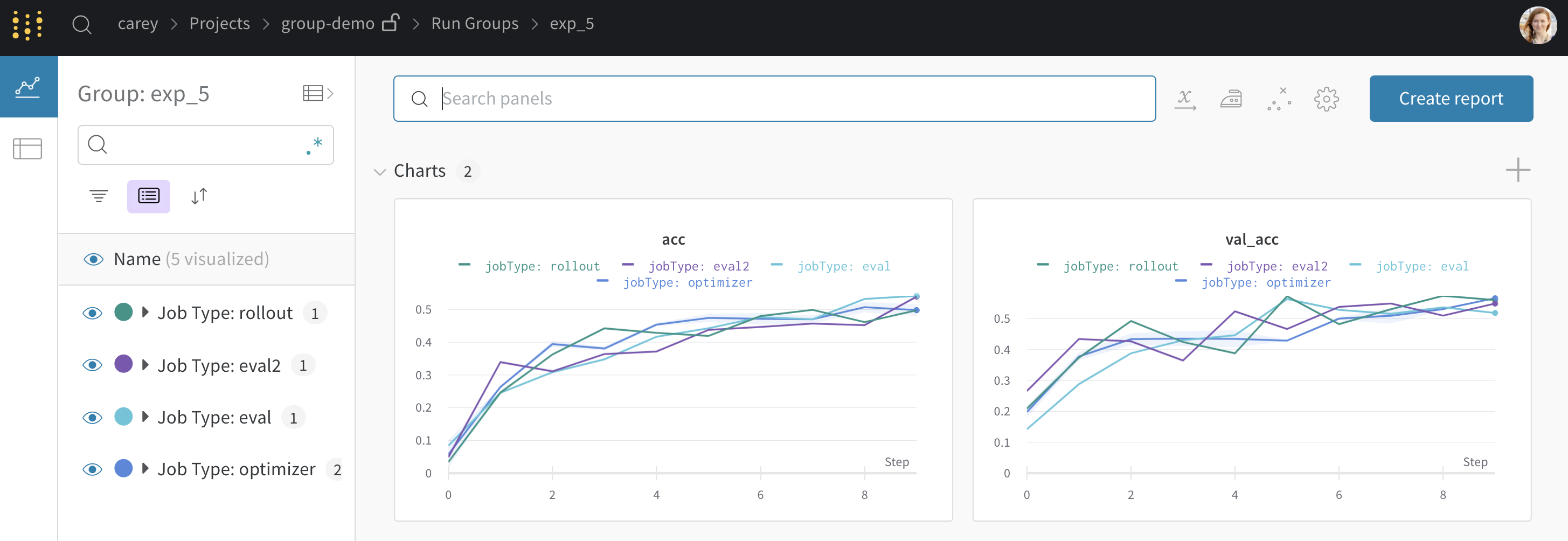 オプションで groupjob_type を wandb.init() に渡します。これにより、各実験に対して専用のグループページが作成され、個々のrunが含まれます。例: wandb.init(group="experiment_1", job_type="eval")
