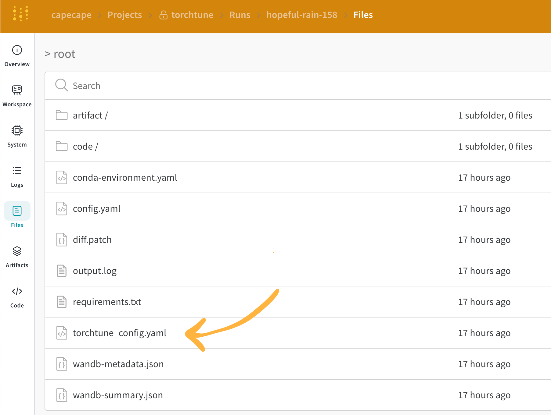W&B 는 Overview 탭에서 확인된 구성을 캡처합니다. W&B 는 또한 YAML 형식으로 파일 탭에 구성을 저장합니다.
