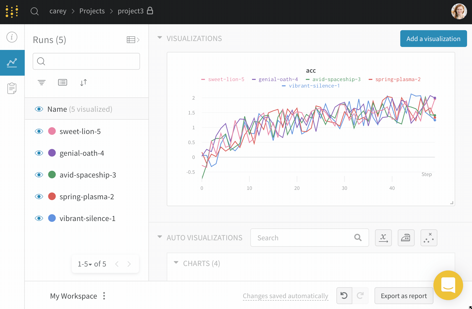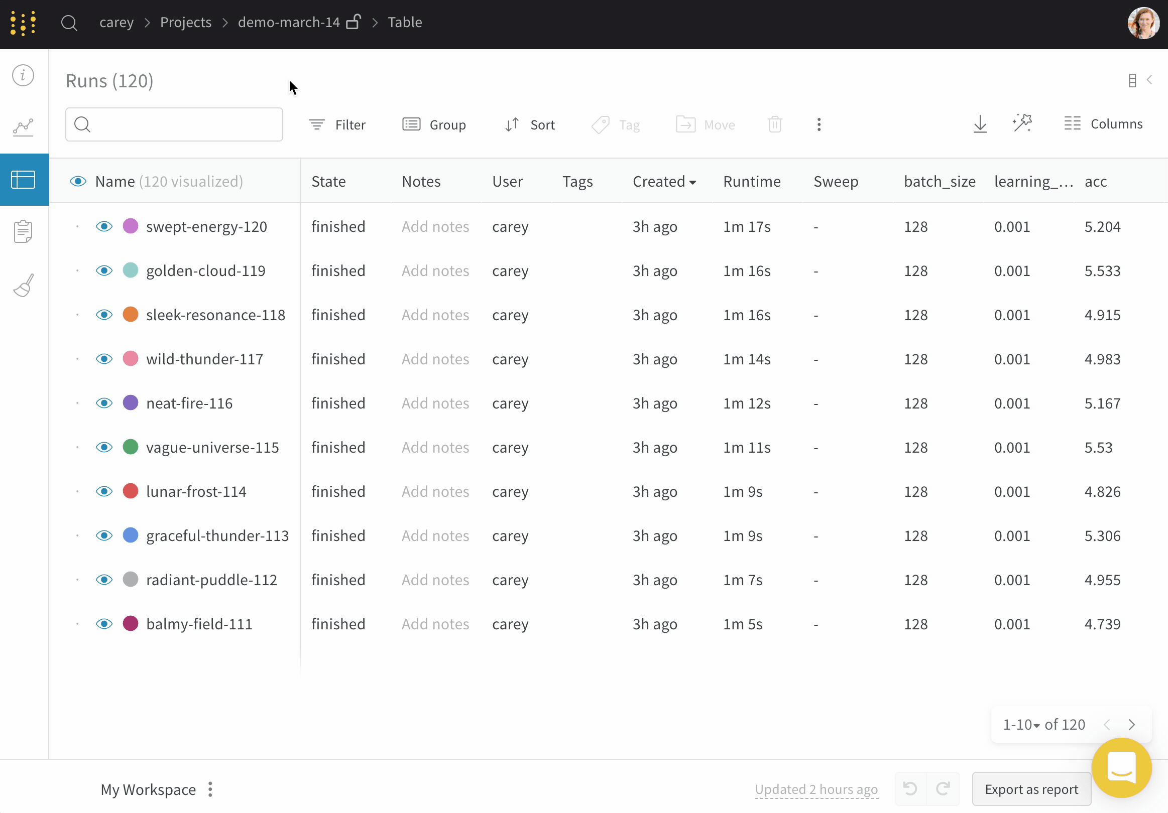 Runs 탭을 사용자 정의하려면 Project page를 참조하세요.